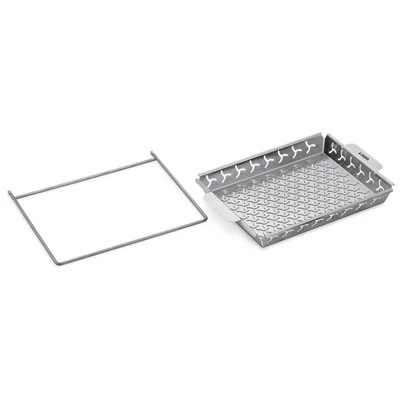 Compatible with the Elevations Tiered Cooking System (ETCS) and Genesis II Models, the basket sits in a wire frame which attaches to the tiered rack and hovers the basket above the cooking grate, leaving more room below.