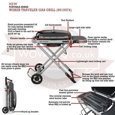The Weber Traveler uses disposable gas canisters. Adapters are available for larger patio gas bottles. The design features a black porcelain enamelled lid and cook box for superior heat retention and durability; as you’d find in a top end Weber charcoal BBQ like the Weber Summit or any Weber Classic Kettle since 1952. A well tried and tested feature on a Weber BBQ – robust and built to last.